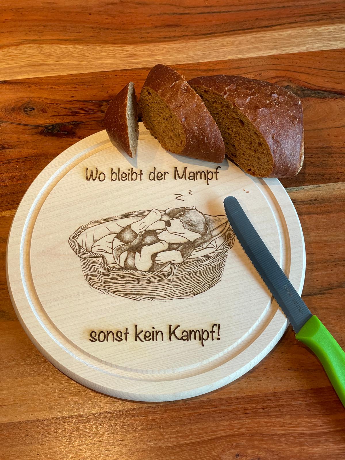 🐶😄 Dieses personalisierte Frühstücksbrettchen aus Holz bringt Humor und Dackelliebe direkt an den Frühstückstisch. Auf der Vorderseite sorgt ein schlafender Dackel im Körbchen mit dem Spruch „Wo bleibt der Mampf… sonst kein Kampf!“